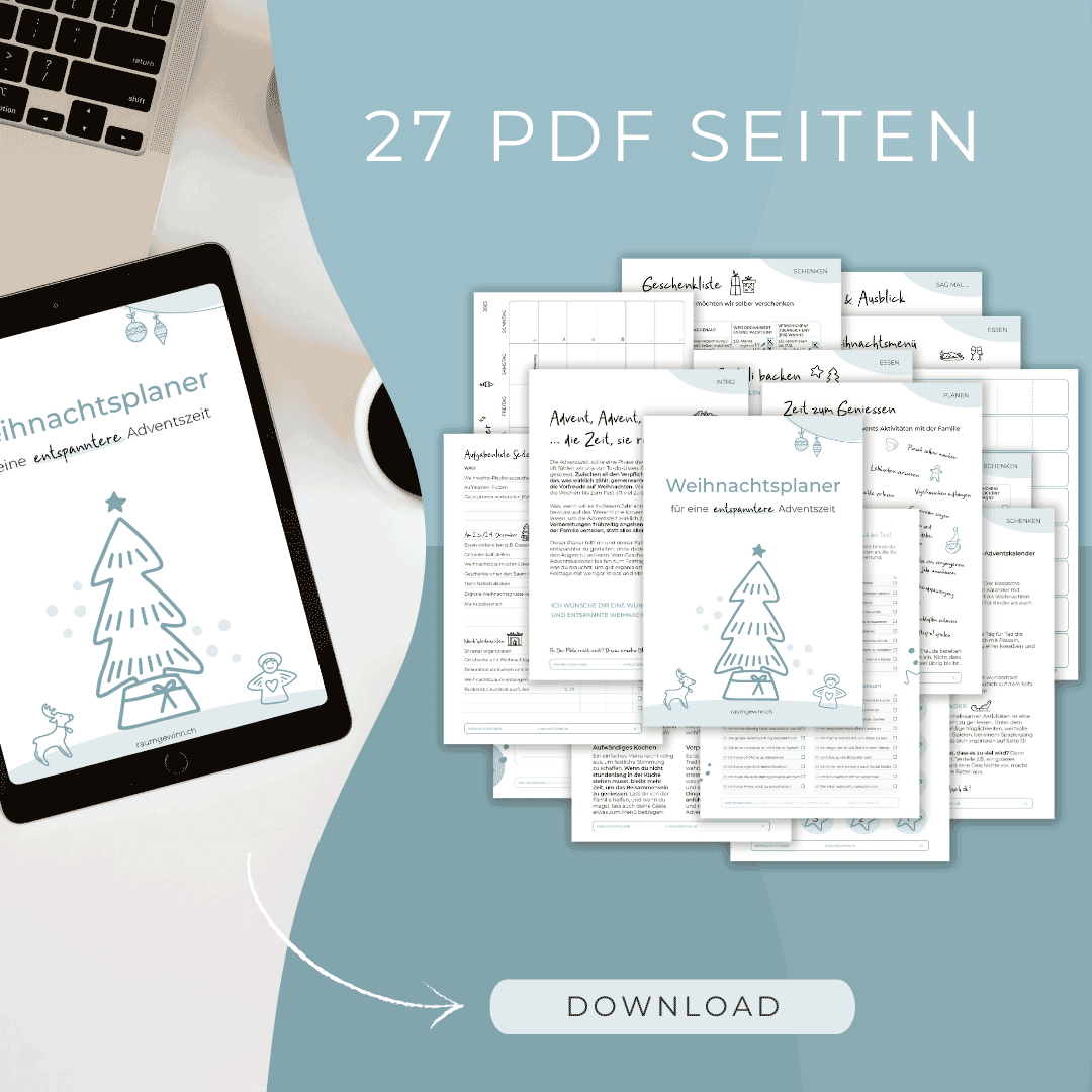 Dieser liebevoll gestaltete PDF-Weihnachtsplaner unterstützt dich mit Checklisten und Vorlagen – damit du entspannt organisierst, nichts Wichtiges vergisst und die Adventszeit mit deiner Familie geniessen kannst.